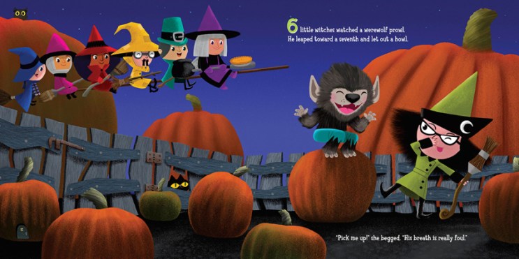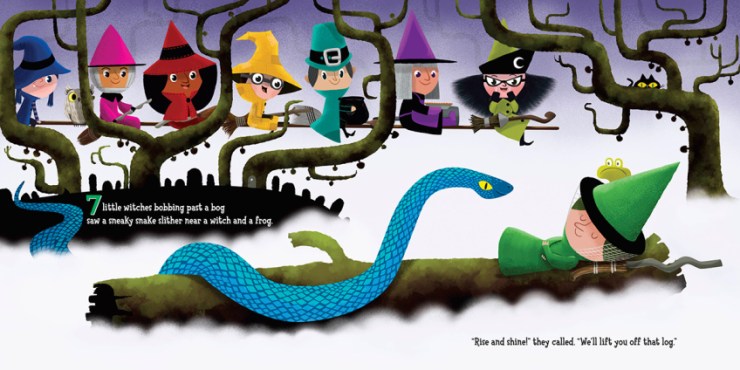 Originally published in hardcover (2016), this board book version of the rhyming, counting story follows a group of little witches as they rescue one another from mischievous skeletons, ghosts, and goblins. The digital artwork is bold and bright, and the witches have eschewed basic black for jewel tones and fashionable hats. There’s some diversity among the witches, too; something always nice to see. One witch even sports a hijab under her hot pink pointy hat! The fonts are bold and white, set off against the nighttime backgrounds of each spread, and the numbers are brightly colored, large, and bold. It’s a fun story for little Halloweeners to enjoy, and the sturdy board book will hold up to multiple readings.