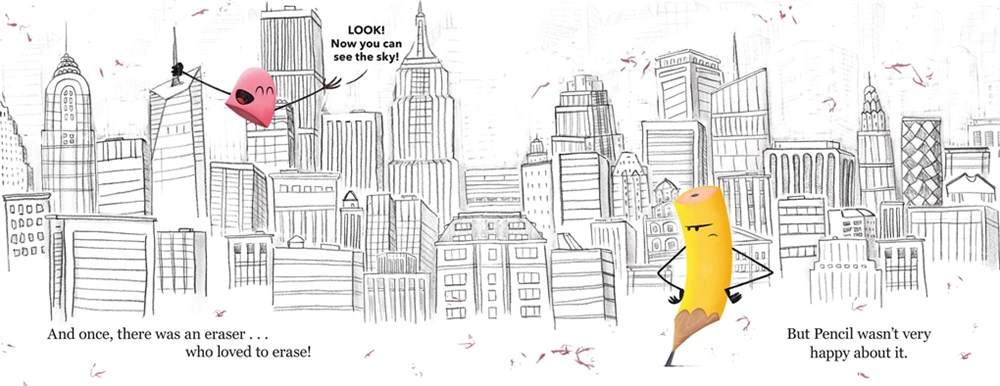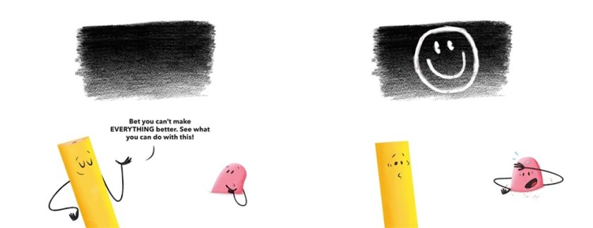 When Pencil Met Eraser is a story about teamwork, about friendship, and about creativity. It’s very similar to Max Amato’s Perfect, and I love both books’ use of erasure to create art. Pencil is adorable, with a wide-open smile and who performs acrobatic moves throughout the story, as he buzzes around Pencil’s creations; Pencil is a sweet curmudgeon, with hands pressed to his hip area and a slash for both eyebrows and mouth. He softens up and reveals a sweet smile all his own.