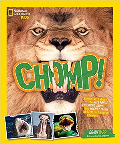 CHOMP!: Fierce Facts About the Bite Force, Crushing Jaws, and Mighty Teeth of Earth’s Champion Chewers ($12.99, ISBN: 978-1-4263-2839-8) has been on my shelves since this summer, and I see it wandering around the tables at the library (meaning, the kids are reading it while they’re in the library during the day) pretty regularly. Written by “Extreme Animal Explorer” Brady Barr, CHOMP! has a lot of pictures of a lot of big, mean teeth. The first page has a hippo, jaws open wide, greeting readers, and those choppers are intimidating! Barr organizes his chompers into four groups: the grippers, slicers, crushers, and gulpers; bite force and preferred menu for each animal profiled appear on each page. Barr jumps in with his own entertaining anecdotes, Brady’s Bite Stories, that will make kids squeal and cringe all at once; I’m thinking of reading the one about Barr squeezing a live otter out of a gator the next time I have a class visit. I like to be memorable. Further resources, a glossary and an index, make this a good companion guide for animal reports and fun reading for animal fans.