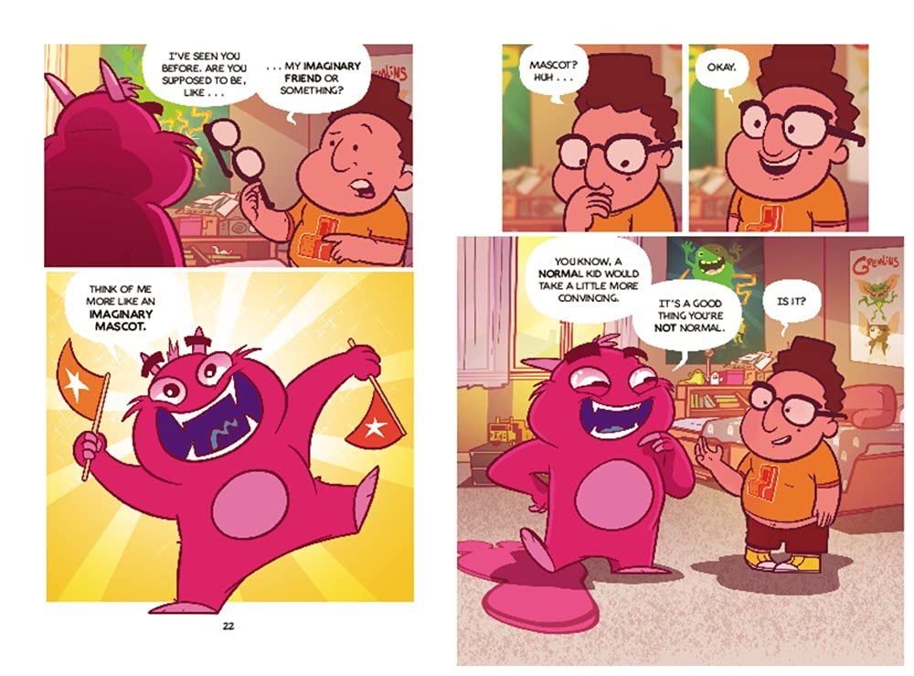 A memoir of Yehudi Mercado’s Mexican-Jewish upbringing, Chunky is more incredible storytelling. Set in the 1980s, Hudi has one lung after a childhood battle with lung disease, he’s overweight, and he loves video games, science fiction and fantasy, and being the funny kid. His parents want him to lose weight and be healthier, and try to push him toward different sports to get him more active. Hudi, not particularly in love with the idea, goes along with his parents to make them happy, but creates an imaginary friend: a pink-furred   cheerleader/mascot called Chunky, to cheer him on as he tries – and flops – at baseball, swimming, and tennis. Chunky is there to tell Yehudi he’s better at comedy and drawing; he’s Hudi’s inner compass, telling him to stay true to himself. When Hudi’s father loses his job and has to move to another state to find work, he finds himself faced with a crossroads and joins the football team in a last bid to fit the image his parents want to have of him. Chunky is more than a memoir; it’s a story of trying to please others before yourself; it’s a story of using humor as deflection; it’s a story of listening to your true self. Hudi is funny – he can’t help but crack up people he comes into contact with, especially medical professionals – and he’s pretty game to try anything his parents want, even if his heart may not be 100% committed. He’s good-natured and kind, which makes his break with Chunky painful when he attempts one more sport to satisfy his parents. We want funny Hudi back! We want to go get ice cream with him and feel like everything will work out! The artwork is bright, colorful, upbeat, and loaded with great details, like Hudi’s t-shirts (console video games! Chewbacca!) and his room, which his father constantly redecorates to affirm his dedication to the latest sport Hudi’s involved with – and that Chunky and Hudi take great pleasure in defacing time and time again. I can gush about Chunky all day, so let me just say that this is another must-add to your shelves.