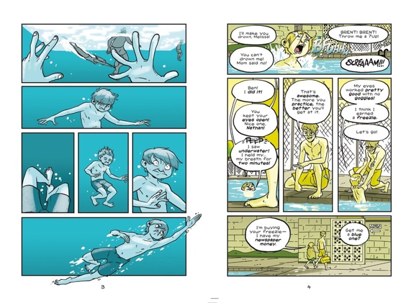 Inspired by events in his childhood, Wings of Fire and Secret Coders illustrator Mike Holmes delivers a graphic memoir with a splash of fantasy. Nathan is alone, but for his older brother, Ben. His other siblings and the neighborhood bullies torment him, but he always looks to Ben to spend time with; Ben is the one person who gets him. Unfortunately, there are things coming up that take Ben farther and farther away from Nathan, leaving him to create a fantasy world to escape to when the real world intrudes too much. A study in grief, loss, and healing, My Own World is a better reading choice for middle schoolers than younger readers; there’s trauma contained within these pages. It’s an excellent starting point for discussions on the lingering damage done by bullying, loneliness, and coping with loss. The real world is depicted in flat colors, but Nathan’s fantasy world is alive with color, vibrancy, and engaging characters that Nathan creates to spend time with.