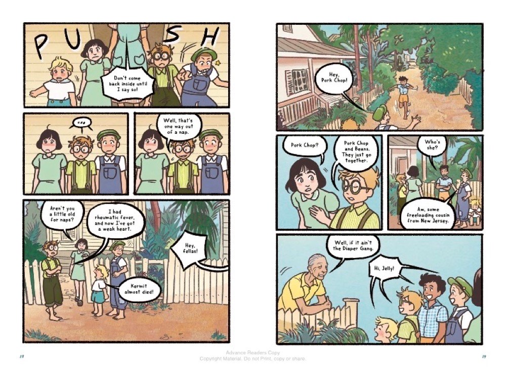 This graphic novel adaptation of Jennifer Holm’s 2010 Newbery Honor-winning novel is simply gorgeous. Set in 1935, eleven-year-old Turtle is a girl who’s had some tough times. She’s more level-headed than her mother, loves the movies, and really doesn’t like Shirley Temple. While figuring out where life will take her next, her mother sends Turtle to Key West, Florida, to live with her aunt when she takes a job housekeeping for a woman who doesn’t like children, and Turtle has never met her aunt or the many cousins she’s now living with. She starts getting into the swing of things, following the “Diaper Gang”: neighborhood boys with a babysitting club and a secret diaper rash formula that puts them in high demand. As she gets into a day-to-day groove, she learns some family secrets that leave her wanting more: more of her mother’s past, more of her family history, just… more. A family study, a piece of historical fiction that examines life in Depression-Era Florida, and a strong, smart female protagonist make this a great enough story, and then you Savanna Ganucheau’s artwork: filled with lush and humid outdoor spreads, we get a picture of 1930s life in Key West. Turtle’s cousins run barefoot through their day, while Turtle insists on her shoes. Babysitting moments are laugh-out loud funny, and Turtle interactions with a cantankerous senior citizen will make readers chuckle and admire the girl’s tenacity. Inspired by Jennifer Holm’s great-grandmother’s life in Key West, this is an adaptation that your readers will love and will absolutely gain the story some new fans.