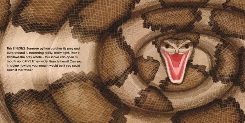 Fans of Steve Jenkins’s Actual Size books will enjoy this look at some of the deadliest animals on the planet. Opening the book, readers are greeted by lifesize rendering of a harpy eagle’s talons, outstretched and ready to grab… your nose? Your arm? Page after page of life-sized color illustrations, accompanied with factual, easy-to-read text, present predators like the dragonfly (don’t laugh – you’re not a small insect!), the black caiman (so many teeth), or a lion (spiky tongue). Spreads lead up to the fold-out great white shark’s mouth, big enough to swallow… the reader? Back matter includes statistics on profiled animals, including how many LifeSize books it would take to measure one. A good companion series to the Actual Size books. LifeSize Deadly Animals is the fourth in the LifeSize series.