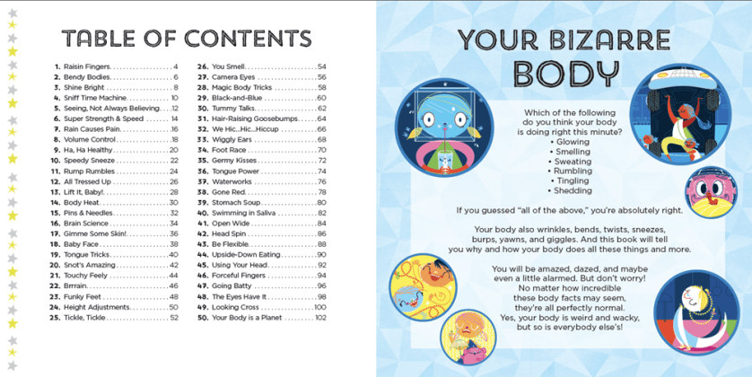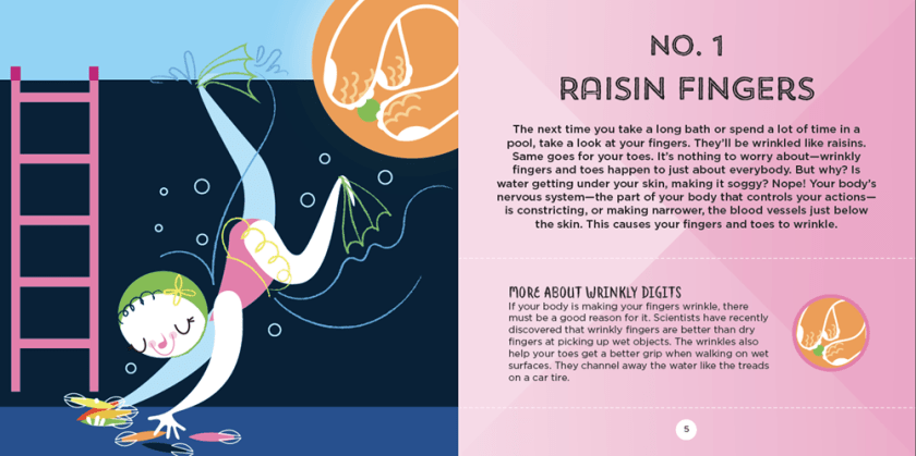 Our bodies do some wild stuff. A sneeze moves at about 100 miles per hour. (Think about that, next time someone doesn’t cover their nose and mouth when they sneeze near you.) If someone tickles you and you put your hand on theirs, it’ll send a message to the brain that stops the tickling sensation. Wrinkly bathtub fingers help us grip things better. Readers will learn all of this and more in 50 Wacky Things Humans Do, written in a similar vein to the chunky, digest-sized NatGeo Kids fun fact books. Wacky Things features one fact per spread and one colorful, fun illustrations; good for intermediate-level readers.