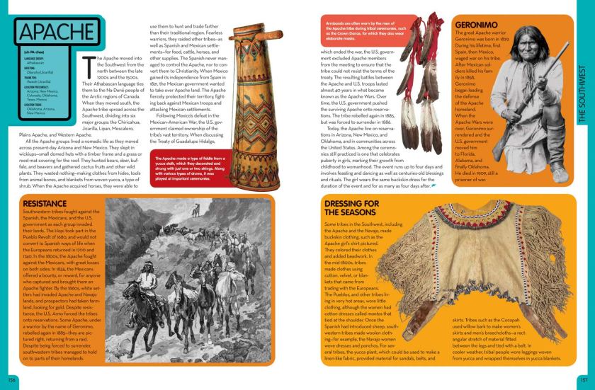 This encyclopedia features over 160 Native American tribes, organized by location: Arctic and Subarctic; Northeast; Southeast; Plains; Southwest; Great Basin and Plateau; Northwest Coast, and California. Each section includes maps, timelines, and a traditional story from the region’s people, along with profiles of each tribe and biographies on key Native Americans in history. The photos are gorgeous, and the information is comprehensive. There’s a glossary, index, list of federally recognized tribes, and list of consultants who contributed to the book.