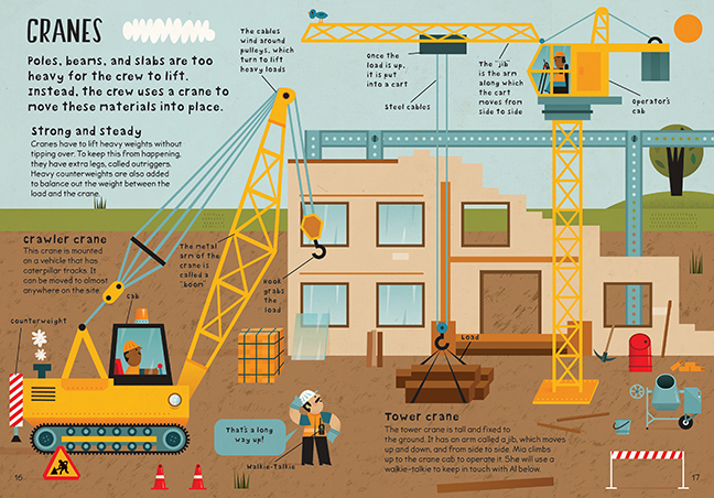The model pieces come together like puzzle pieces, allowing you to create 3-dimensional fire trucks, construction equipment, ground crew at the airport, and a radio tower, most with moving pieces. The dump truck will tip, for instance, and the fire truck ladder will lift. The book includes instructions in addition to facts about fire stations, construction sites, and the airport. The illustrations are very cute and there’s a lot of information available, in a readable and easily digestible format.