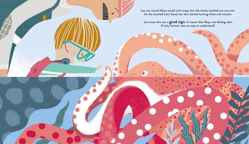 A class trip to a forest is a study in interconnectivity. Each of the class interacts with their environment in their own ways, illustrating how we each relate to our surroundings. Sasha, a student with a white cane who codes as being blind, listens to the differences in bird sounds as they change position; the surrounding trees and plants creating “sound shadows”. Angel, a student who gets “caught up in the moment” and “often misplaces things”, is much like a squirrel, who buries more seeds than he will need to get through winter, just in case he forgets where he saved everything. Student Joy appears to suffer from anxiety, is worried about her class assignment, but the soothing network of her classmates – her ecosystem – sustains her just as the orchid sustains its environs. A moving meditation on how we all come together to create a diverse and vibrant world and how we are connected to our planet. A good addition to picture book collections. Mixed media illustration includes a diverse and inclusive group. Use this book to encourage discussion. Together, a Forest has a starred review from Kirkus. Download a free activity kit from MacKids School and Library.