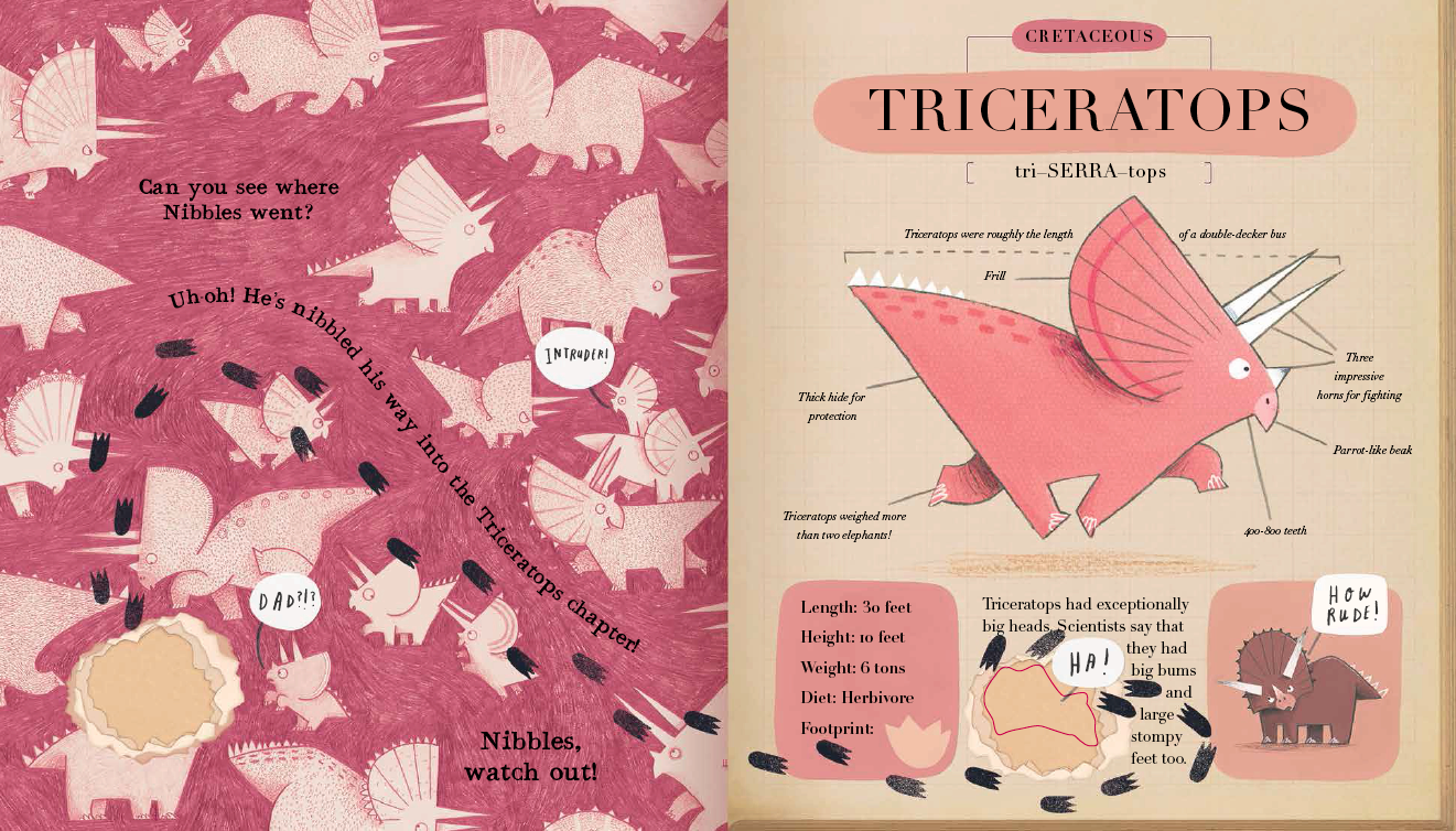 Nibbles: The Dinosaur Guide is full of the same flips and bite-sized page nibbles that makes the first book so much fun to read. Add to that, the hilarious bodily functions of dinosaurs (did you know that a single diplodocus fart could power a hot air balloon? You do now!) and a laugh-out-loud interaction with a T-Rex, and you have a dino book that kids will come back to again and again.