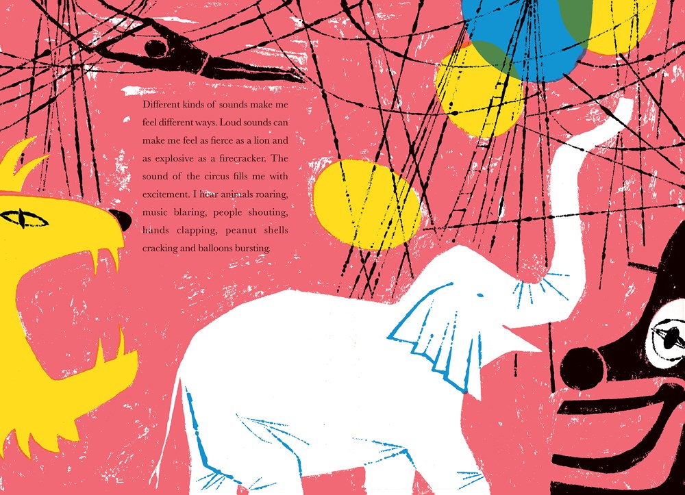 “Loud sounds make can me feel fierce as a lion and as explosive as a firecracker. The sound of the circus fills me with excitement. I hear animals roaring, music blaring, people shouting, hands clapping, peanut shells cracking, and balloons bursting.”