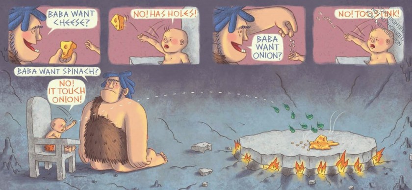 This, friends, was my life story, three times in a row. When Baba doesn’t want spinach because it touched the onion? I felt that in my soul, especially because I have a 9-year-old who STILL gives me a hard time about what I lovingly refer to as “food cooties”. I love the adorable details in this book, like the cave painting door art, and Dada’s creaks and groans when he gets up. The artwork is just so much fun, with facial expressions that are perfectly spot on. Endpapers look like a warm cave interior. The story’s ending gives me hope that there will be a third installment in the Cave Dada series; I think we all need to see Cave Dada: Bathtime, don’t you?