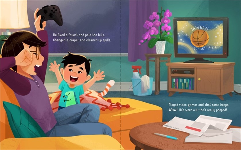 A tired daddy asks his son to take over daddy duties for a little while in this companion to last year’s You Be Mommy. Rhyming verse takes readers through all the things Daddy has done today, from breaking up a food fight, to household duties, to teaching the cat a trick. There’s sweet repetition interspersed with Dad’s day and with Daddy duties he’s handing off to his little one, like building a bedtime fort and lending him a night light and stuffed dinosaur. But when the day is done and it’s time for bed, Daddy is happy to take back Daddy duties and put his little guy to bed. Gentle storytelling and the repetitive phrase, “Daddy’s too tired to be Daddy tonight”, empowers children to take on the fun part of Daddying, while reassuring them that, at bedtime, Daddy’s going to be the one to tuck them in and snuggle them to sleep. The family is Asian, and subtle details like a door decoration, a koi painting, and family portraits infuse the setting with a personal and cultural feel.  The household is warm, welcoming, and will make readers feel right at home. Endpapers show he family cat snuggling and stretching around the house. An adorable celebration of dads.