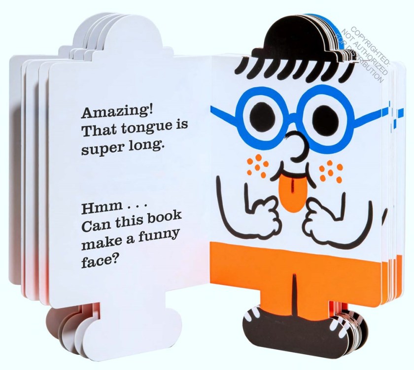 This book is perfect for readalouds! Shaped like a fun little rectangular being with round, blue glasses, it’s a book that can do anything – and just begs for you and your readers to join the fun. Every spread asks a question: Can the book wink? Can it blink? Put a finger in its nose? The book rises to the occasion, and now it’s up to you to see if your readers can do all the fun things Book can do. The book is expressive, friendly, and just goofy fun, with a fun pull-tab surprise at the end. High contrast black and white expressions join with colorful bright blue glasses and bright red-orange pants and freckles to grab readers’ attention. Add this to your interactive storytimes (anything by Herve Tullet will do) and add a Simon Says game to the fun!