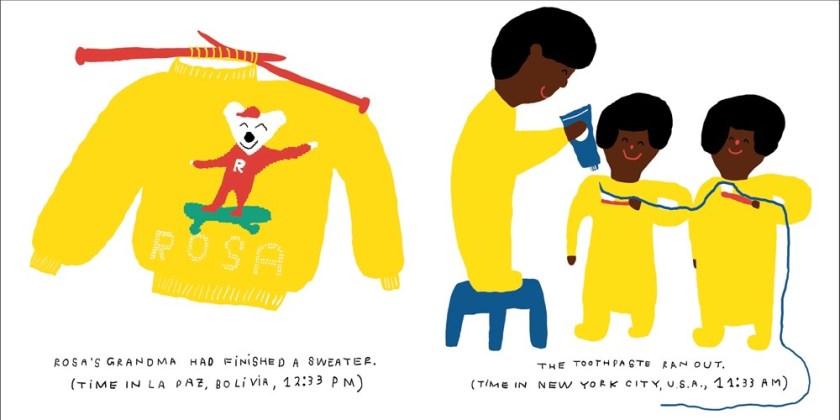 Originally published in Dutch in 2020, this board book is full of fun lift-the-flaps. Guided by two ducks, each page challenges readers to use their imaginations to see beyond the everyday, whether it’s discovering that a raccoon is behind a washer, or that a pelican is behind a sink. Questions prompt the imagination by asking the reader who they think will be revealed: perfect for lapsits and small readalouds! A final flap is the most fun reveal of all, bringing everyone together. The artwork is colorful and the flaps are sturdy, holding up to repeated use. The animals have friendly expressions, and the everyday housewares are easy to recognize. Ask your readers what else they see on each spread, whether it’s a color, shape, or additional details, from a tea bag to a couch pillow. Then ask them what could be behind items in your home, class, or library: maybe there’s a giraffe behind a floor lamp, or an – ouch! – porcupine by that footstool.