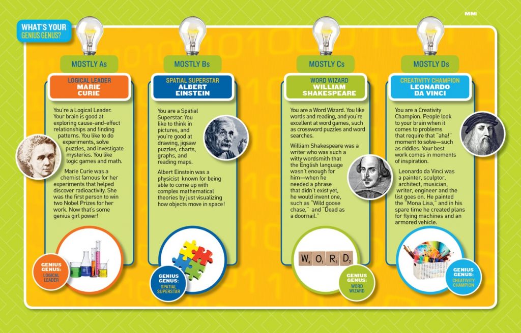 Guided through the book by cartoon characters Ima Genius and her canine sidekick Astro, Mastermind is all about the brain: each section is devoted to a different part of our brains and features sections like How it Works, where readers are guided through a step by step process of each part of the brain makes operations like sight, muscle movement, smell, and memory happen; fun facts and wild photos help break it all down for readers. Time Trials challenge readers to solve puzzles while timing themselves, and a final quiz in each chapter, called Test Your S.M.A.R.T.S. (Superior Mental Acuity and Rationality Testing System), pop up in each section, so budding geniuses can witness themselves becoming smarter with each section. A fun Mastermind Meter lets you track the progression of your genius through the book.