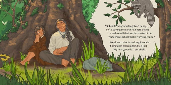 Wenonah is a young Ojibwe girl from northern Wisconsin. She seeks out her great-grandfather to talk. She’s upset; the chimookomaan school – the white school – she’s forced to attend has cut her hair; forbid her from speaking her language; and won’t even let her use her real name, telling her that she must now refer to herself as Evelyn. Set in the early 1900s, during the period where Native American children endured abusive forced  assimilation efforts that attempted to erase Native history, Remembering Green is a powerful story of remembering. Wenonah’s great-grandfather has wisdom in his words as he speaks about fear of the unknown, which motivated the U.S. government’s actions, and he leads Wenonah on a walk through nature, reminding her to “remember the green”: remember her people, remember their connection to the land, and remember who she is. A glossary and a word on the Indian residential schools make up the back matter. A strong supplemental text on a dark period in U.S. history, Remembering Green is a good addition to collections but should not be considered an #OWnVoices work. The artwork is bright, with natural greens and browns dominating the scenery. Wenonah and her grandfather have beautifully expressive faces, with their eyes communicating volumes.
