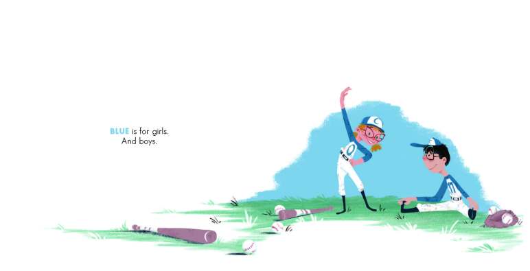 For those of us who are tired of the “blue is for boys, pink is for girls” madness, Robb Pearlman is here! Pink is for Boys is a lovely and fun concept book about colors that delivers the wonderful message that ALL colors are for EVERYONE. Spreads alternate between introducing colors and what else they’re popular for. In the first spread, a boy and a girl are getting ready for a party; he wears a pink shirt and bow tie; she’s got a pink dress with a long ribbon. The text reads, “Pink is for boys. And girls.” In the next spread, boys and girls wearing different shades of pink dance in a pink room, festooned with pink balloons and banners, and the text notes, “And bows on fancy clothes.” Each color is featured in the text and in the art, and shows boys and girls enjoying a game of baseball; playing royalty; enjoying nature and racing a go-kart; enjoying the summertime, teddy bears, pets, and most important of all, unicorns! Unicorns are for boys and girls! The text is decisive: all colors are for everyone. Period.