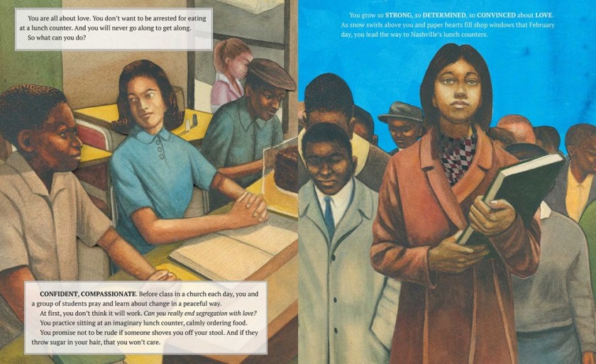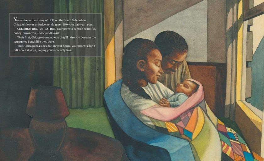 *“During the 1960s, Diane Nash was one of the most influential and effective leaders of the Civil Rights Movement, yet most people don’t know who she is.” Wallace’s latest picture-book collaboration with Collier seeks to correct that ….the book opens with images of Nash’s parents cradling her as a baby and then of Nash, as a small child, being hugged by her grandmother, highlighting the love that encouraged her activism.