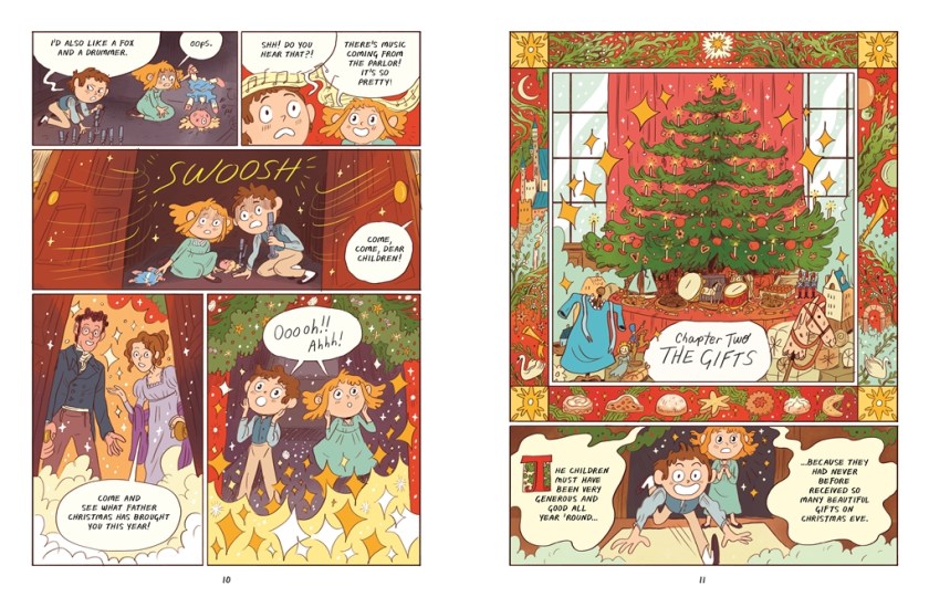 Let the holiday book love commence! The graphic novel retelling of the beloved Nutcracker classic is both fantastic and surreal. Organized into 14 chapters, the story of Marie and Fritz Stahlbaum has all the characters readers have come to know – or discover: Fritz’s Hussar soldiers and Marie’s doll, Miss Clarette, the wicked Mouse King and his army, and the Nutcracker. The story unfolds like a fever dream, shifting between Marie’s dreams and the wide-awake storytimes told by their godfather, the children’s uncle Drosselmeyer. It’s manic, often creepy, and a new spin on the classic tale. Give this to your adventure and fantasy fans. An author’s note talks about the original story versus the adaptation that Natalie Andrewson ‘wanted to tell’.