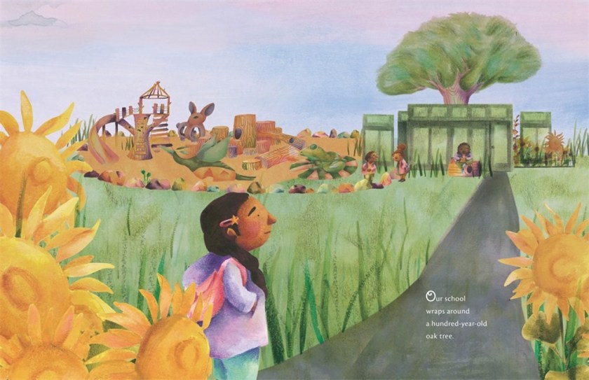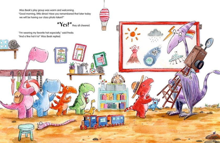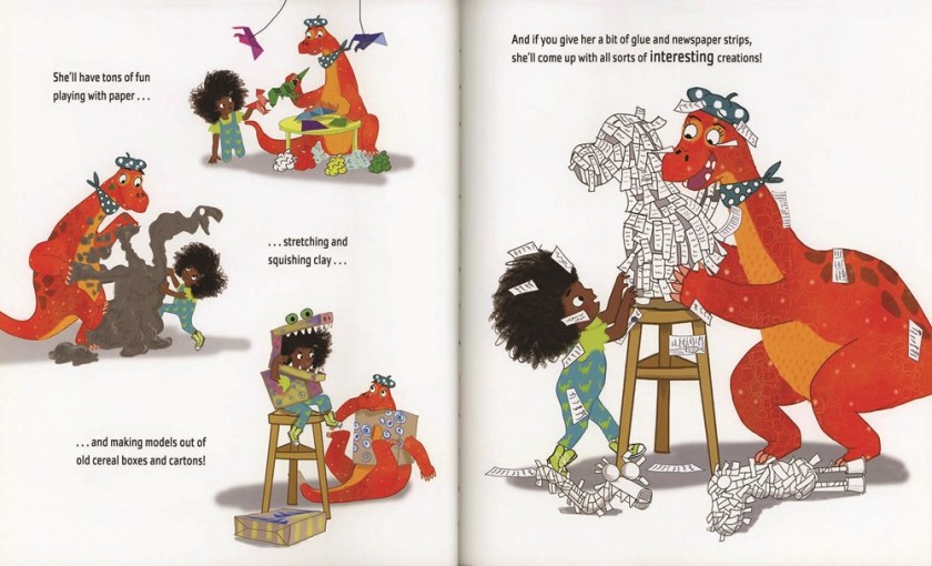 The third book in “Never Let a Dinosaur…” series from Sirdeshpande and Ewen is here! The imaginative young girl is back with a new dinosaur and a new adventure, this time, teaching her diplodocus to draw. In cumulative fashion, the diplodocus lets her imagination run wild, becoming a global art sensation; her artwork selling for “gazillions” of dollars and her scupltures in demand from mayors all over the world’s cities. What happens when the paint factory can’t hold any more paint? You’ll have to read to find out. The story touches on the many ways we create and enjoy art, and Ewen’s colorful illustations place humans and dinosaurs side by side. A fun readaloud with a playful conclusion, Never Let a Diplodocus Draw is a cheery art storytime readaloud and pairs wonderfully with its predecessors, Never Show a T-Rex a Book and Never Let a Stegosaurus Do Sums.