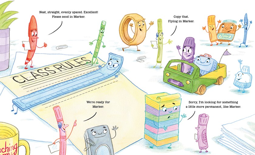 The companion to Anna Kang and Christopher Weyant’s Eraser (2018) is every bit as playful, wonderful, and perfect for back-to-school reading. The teacher’s school supplies are having their meeting and getting ready for the first day of school. Marker has always been one of the teacher’s go-to supplies, but there’s a new supply in town: Pinking Shears! The decorative scissors make beautiful, decorative cuts and she quickly earns admiration from the other supplies, even taking Marker’s spot in the vaunted “Teaching is my Superpower” mug. Her self-confidence diminished, Marker makes a mistake, which upsets her so much, she makes another mistake! Her friends rally around her, and Marker’s fear comes out: she’s permanent. Her mistakes can’t be erased. Luckily, these supportive supplies are there to save the day, and help Marker understand that it is okay to make mistakes. Kids will love being reunited with their school supply friends, including Eraser, Pencil, and Sharpener. Kang uses character dialogue to tell the story, and creates a delightful character study using the familiar aspects of each of the supplies: Stapler, for instance, can’t wait to “sink [their] teeth into those math packets”, and Post-Its helps construct a play city out of their notes. Class Rules include familiar guidelines like, “Be respectful and kind”, “Include others, don’t exclude”, “Raise your hand to speak”, and “Listen”. Filled with school supply puns and wonderful messages about making mistakes, Marker should be on the top of your back-to-school purchases and read-alouds.