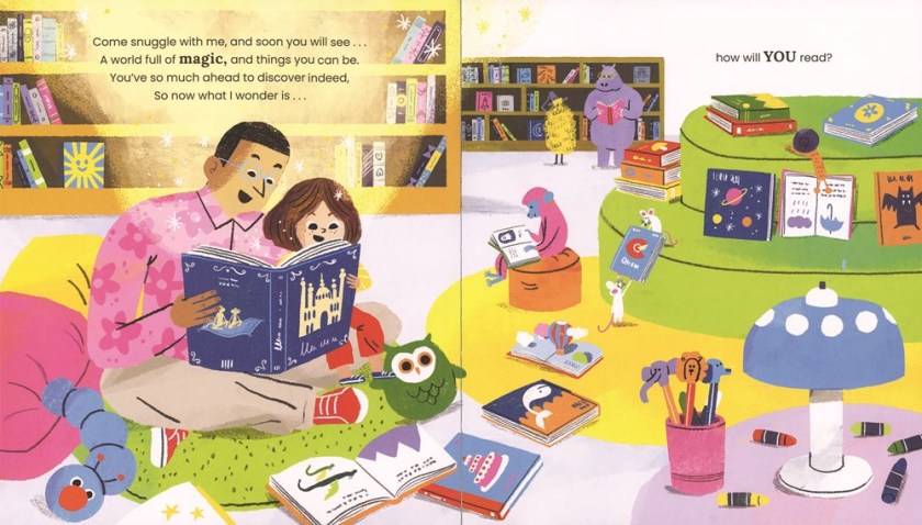 Inviting readers to join the “most welcoming club in the world”, Baker weaves a rhyming tale about all the ways there are to enjoy a story: “Will you pore over / e…ve…ry / word in a hush? / Or speed to the end in / an almighty rush?”Animals and humans enjoy books in a variety of locales, from a tent under the stars to a hot air balloon in this paen to the joy of reading and imagination. Baker touches on favorite genres and formats, like graphic novels and poetry; the process of finding that just-right book; and the experience of reading: “Will you laugh out loud? Gasp out loud? Call out together?” Reading is an activity that unites readers, thus creating what Baker calls – with great reason – “the most welcoming club in the world”. de la Prada’s cheery illustrations show groups of readers together; parents and children, and solitary readers alike, all enjoying a story and showing everyone that there’s no one way to enjoy a book. Navy blue endpapers display a variety of outlined characters reading; books are a bright yellow, offering a beacon to adventure. An excellent readaloud choice for those first weeks of school, for library class visits, and storytimes alike. All the Wonderful Ways to Read was originally published in Great Britain.