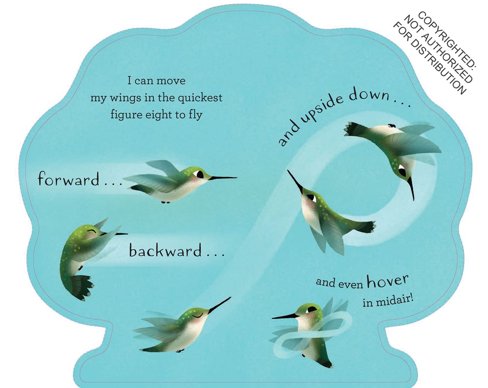 This adorable book comes with two hummingbirds, attached to ribbons, that readers can use to swoop and play with the hummingbird narrator. A friendly hummingbird greets readers and takes them through a day in the life: swooping and flying, enjoying flower nectar, sheltering and building a nest. Quick, fun facts thread through the narrative, while the colorful artwork and playful fonts engage readers. The book stands up and pages open to become a tree. The pages are sturdy and the ribbons seem to hold up to extra tugging, making this a good storytime/playtime choice.