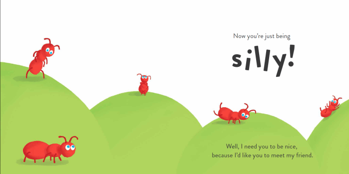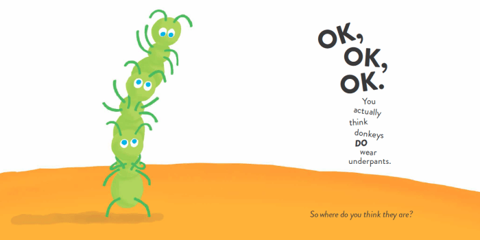 I am having way too much fun with this laugh-out-loud picture book! I Say OOH, You Say AAH plays with words and ideas in the most fun ways; you’re the narrator, speaking to your audience, and leading them through seemingly simple requests. The pictures, however, make your audience say otherwise! If you see an ant, you must say underpants. Which will, of course, happen at the most inopportune moments, like when a shy donkey named OOH (yup, now you’ve scared him) shows up with an ant on his nose.