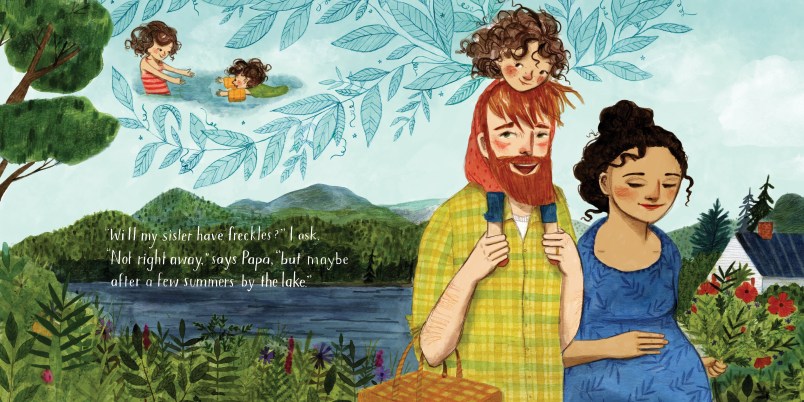 A young girl feels excitement and trepidation at the upcoming arrival of her new baby sister. The text’s language is just beautiful, beginning with the sentence, “Mama has a belly rising up, like a wave. Inside is my sister, waiting to meet me.” The girl talks to Mama’s belly, sings to it, hugs it; she dreams of holding and caring for her baby sister, but she’s also nervous: does she have to share her blanket? Will Mommy ever have a lap again, and will she still have space for her? Will Mama have enough love for both siblings? With gentle text and soft, illustrations, Mama’s Belly is an empathetic, loving story that assuages children’s concerns and warmly welcomes a new family addition.