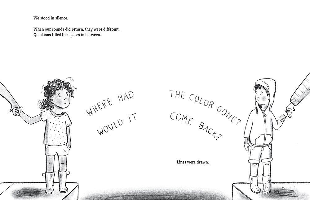Lindsay Ward has beautifully captured how to explain what is going on in our world, on a larger scale, to children. In a world without color, compartmentalized and without diversity, a dull landscape fills the void. Where we had laughter, we have silence. In three words – “Lines were drawn” – we get a mental image of our world today, divided along lines of color, beliefs, opinions. Her artwork communicates the story, with soft color heralding the fade; the storm rains down on the neighborhood, taking with it what little vibrancy remained, and leaving only black and white lines. Bringing color back, we have a rainbow of people and landscapes, happy once more. Can we get there? We have to hope. Lindsay Ward empowers children with her latest story: they have the power to bring color back into their world.