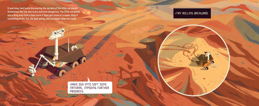 The true story of Opportunity, the Mars rover who captivated watchers on Earth, is the star of this picture book biography. Author Shaelyn McDaniel begins with a story of how humans set and achieved exploration goals: humans wanted to go to the sky, so we did. We wanted to go to the moon, so we did. But when we wanted to go to Mars, it was a little too far away, “so we sent a friend instead”. Opportunity , built by scientists, went into space and spent 15 years on what was originally 3 month mission, but a storm hit the planet, draining the rover’s batteries and shutting her down. McDaniel humanizes Opportunity with phrases like “Oppy called home often” and “she sent selfies so we would know she was okay”; as Opportunity shuts down, scientists sent a lullaby – “a kiss from her friends on Earth”. It’s an emotional moment, made more poignant by Cornelia Li’s digital illustration of a satellite broadcasting colorful musical notes into space. Much of the illustration is orange-red tinged, with and there are genuinely breathtaking moments as Opportunity roves the Red planet, groves digging into the ground and layered dunes. Endpapers show Mars from the Earth’s point of view and Earth from Mars’s point of view, and back matter includes more information about Opportunity. A bibliography is available via QR code. Hello, Opportunity will endear the rover to a new generation of sky-watchers who may be inspired to find her on Mars one day. A sweet storytime addition to your space collections. A downloadable activity kit includes games and the opportunity to send a postcard to Opportunity.