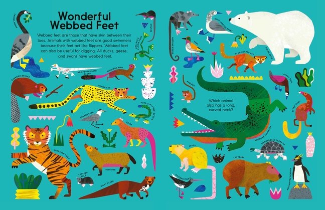 This is a fun animal book for younger kids: preschoolers to kindergarteners are the sweet spot, with older kids enjoying the cool animals that they may not see in animal books. Vibrant colors set off the pages, and each spread features animals with unusual, alliterative, characteristics: Enormous Eyes; Nice Noses; Excellent Ears; Terrific Tails; Dreaded Defenses; Huge Horns; Wonderful Webbed Feet; Lovely Long Necks; Tremendous Tongues, and Fantastic Fur. There’s an introductory paragraph about how these characteristics help the animals, and questions for observant readers to discover and answer. There is always something new to discover here, and the larger size and heavy cardboard pages make this a great transitional book for kids moving from board books to picture books. I enjoy books that give kids a look at different animals, and this has a bunch of good ones, including a sea hare (doesn’t look like a rabbit), an aardwolf (not in the Nice Noses section!), and narwhal, who’s become a popular picture book subject over the last few years. Worth the purchase for your animal book collections.