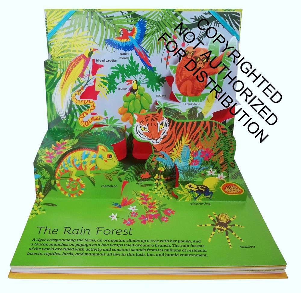 Twirl’s Pop-Up Guides are so much fun for toddlers and preschoolers. The fourth in this series is all about animals and their environments, with spotlights on nine areas: the African Savanna, the forest, the Far North, the rain forest, the backyard, the ocean, the desert, the river and the mountains. A brief factual paragraph gives kids introductory information to each area, and each spread folds out into a 3-D landscape. Animals are clearly labeled, as are environmental objects like pine cones, ice floes, and water lilies. The Pop-Up Guide are great ways to introduce new vocabulary and new ideas, with colorful illustration and sturdy pages that hold up to multiple reads. If you’re putting these into circulation, keep a reference copy on hand for storytimes. Great for a STEM storytime!