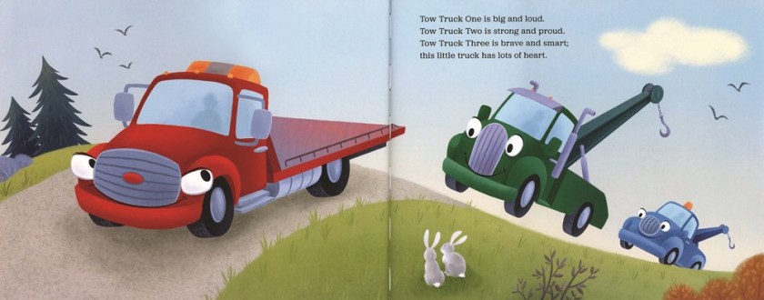 Three friendly tow trucks save the day in this fun rhyming story that teaches color concepts. Each tow truck has a different color, size, and function; they work together to help rescue other vehicles that need help. Truck One is a flatbed who can use her movable ramp to help a car stuck by a highway; Truck two has a hook and chain to pull a friend stuck in the mud. Truck Three also has a hook and chain, and is smaller than Trucks One and Two, giving them passage to smaller spots and able to rescue a friend who’s gotten stuck in a hard-to-reach spot. Cars are colorful, with bright, primary colors, and with friendly, anthropomorphic faces. Endpapers show the cars heading out from the garage to start their day, and returning at the end of the day with the friends they’ve helped. The rhyme scheme makes for a good readaloud, and kids love car stories. A fun addition to collections where vehicle books, like those by Stephen Savage, Kate and Jim McMullan, and Sherri Duskey Rinker do well.
