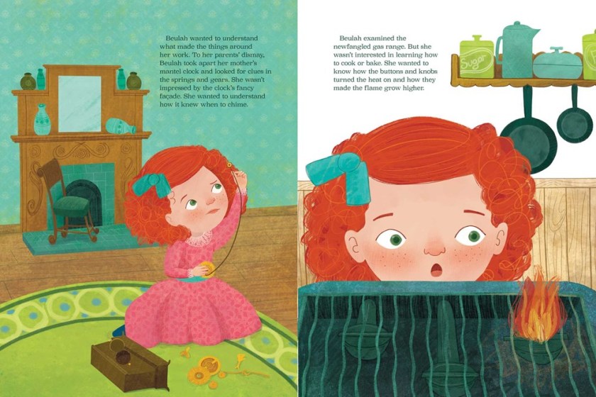 Beulah Louise Henry may be one of the coolest inventors we haven’t heard of. Born in North Carolina in 1887, Henry had both hyperphantasia – she saw things in extreme detail in her mind – and synesthesia – words, numbers, and music all manifested as color in her brain. This all sounds like the perfect conditions to create the perfect backdrop for an inventor, but not so for “young ladies” of the time; Mazeika describes her parents’ frustration at Beulah’s “daydreaming” and taking household gadgets apart to discover their inner workings. Henry’s desire to learn and discover pushed her to invent a multitude of devices; she updated parasol technology and bath toys, baby dolls and ice cream makers. Called “Lady Edison” by a patent office, Henry’s brain was hard-wired to create. Mazeika’s illustration uses bright swirling colors to denote Henry’s synesthesia and brings in different perspectives to allow readers to look over Henry’s shoulder as she creates technical drawings. Back matter includes photos and more notes on Henry, a timeline of her inventions, and sources for further reading. A good addition to picture book and STEM/STEAM biographies.