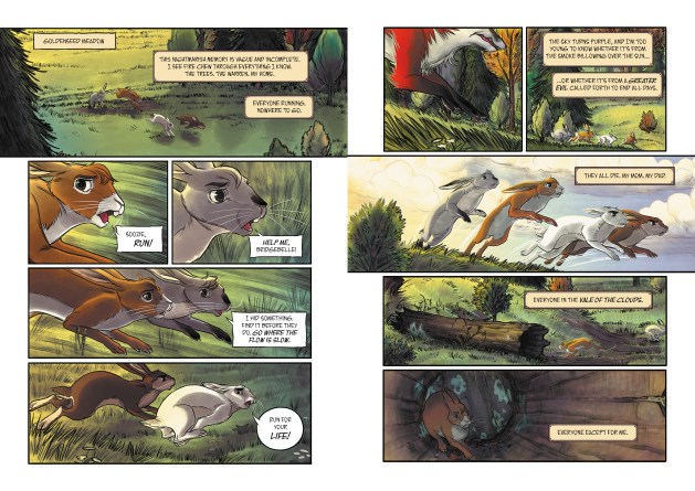Watership Down was one of those novels that changed my life when I was a kid. I first read it at about 9, after seeing the animated movie a year before, and it just blew my mind with its beautiful, yet brutal, story. I’ve returned to the book and movie several times throughout the years, and it remains one of my favorite books. Reading this first story in Jim Pascoe and Heidi Arnhold’s new graphic novel series, Cottons: The Secret of the Wind, reminds me of Watership Down, taking place in a more magical world.