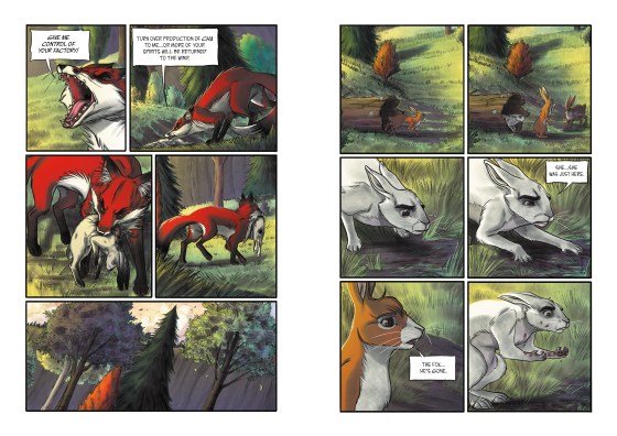 We meet Bridgebelle, a rabbit working in the carrot factory by day, caring for her sick aunt by night. She’s always on the watch for the cruel foxes who prey on the rabbits