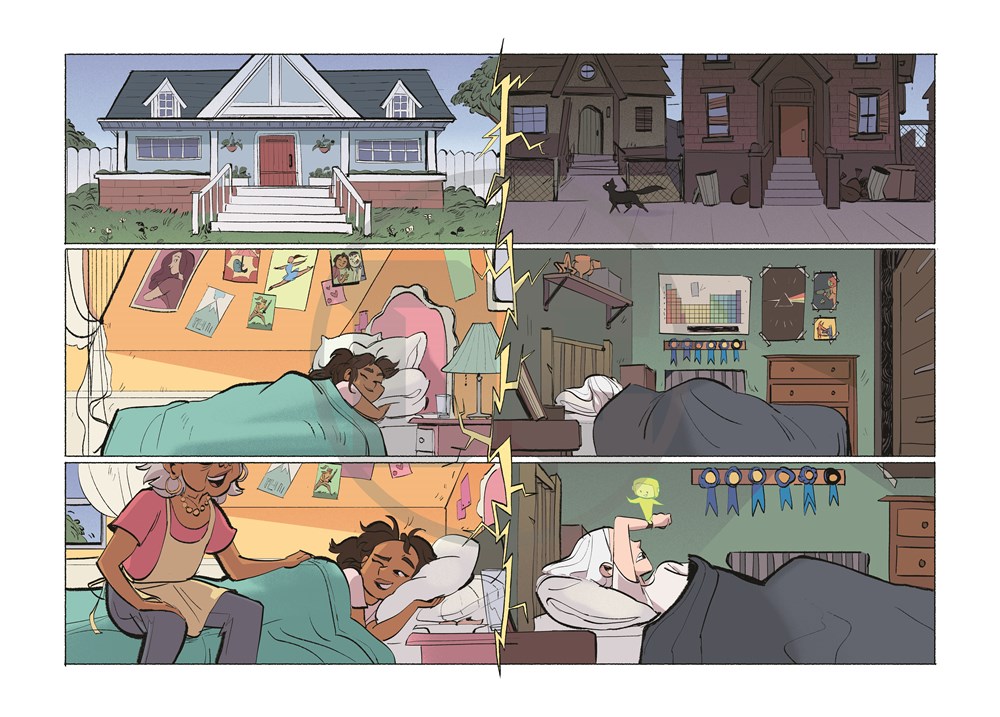The story is fun, with loads of humor and presents the Sloane and Piper as total opposites: Piper wants to be a superhero more than anything else; Sloane wants to work with scientists. While Piper lives with her loving, cuddly grandmother while her scientist parents are away on assignment, Sloane Sloane is at the mercy of her grandfather so that she can care of her ailing mother. Piper dresses in bold, bright colors that work with her cheery outlook; Sloane favors an all-black wardrobe that matches her serious, all-business attitude.