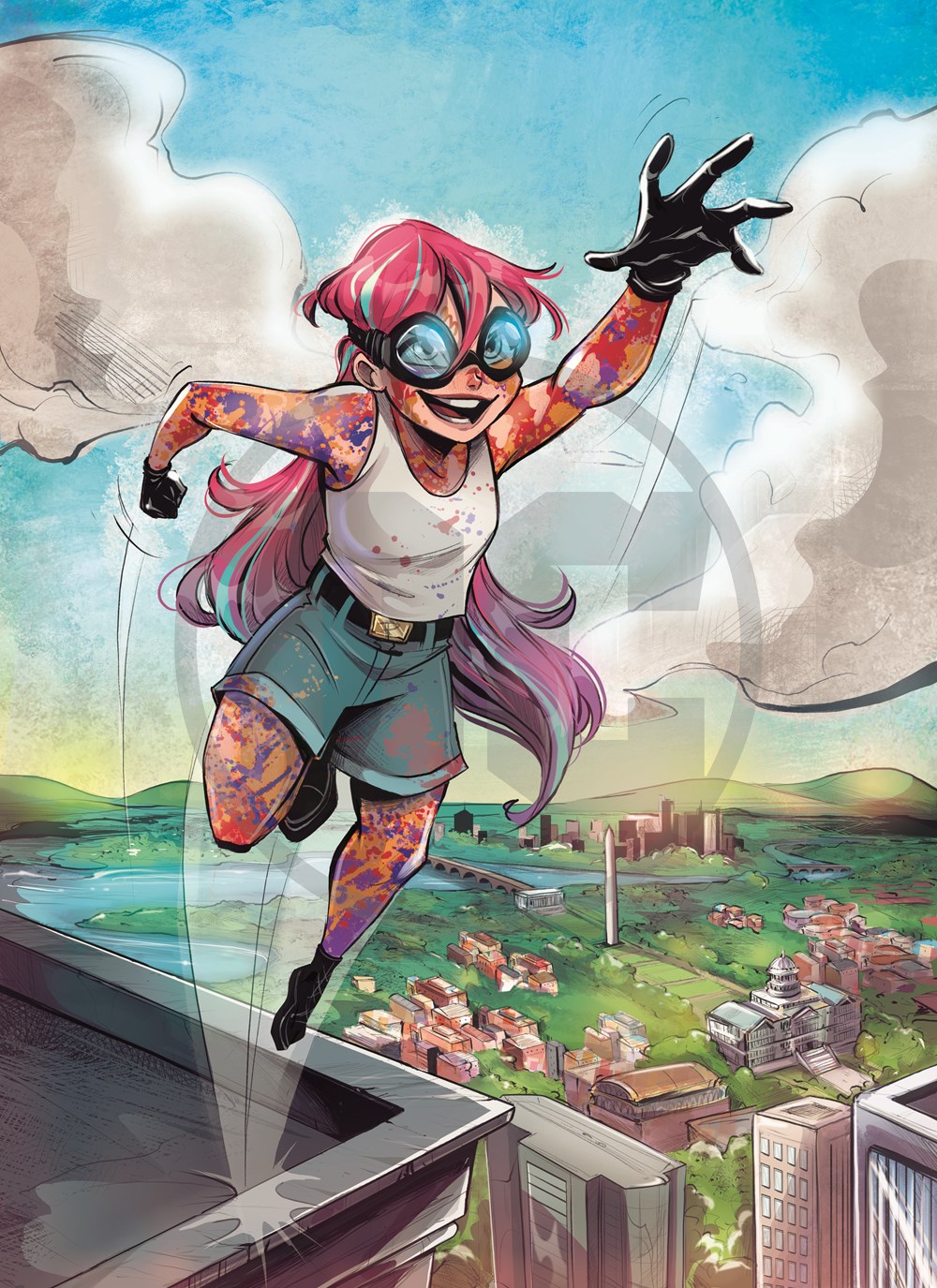 A brand new superhero! Ashley Rayburn is a 13-year-old with a criminal father in jail. She’s bounced from foster home to foster home, but her upbeat spirits have been rewarded when she’s placed with Kitch and Yuka Nolan, who provide a warm, kind atmosphere for her to live. Yuka is a little weird, little secretive, but Kitch tells Ashley not to sweat it. Turns out, Yuka works for a lab, and brings home a super-secret experiment: body paints that grant different superpowers. Ashley can’t resist the chance to play with some paint – hey, Kitch is an artist and encourages her to use his studio, after all! – and makes some very big discoveries! With her new BFF Luke, Ashley starts dabbling in her newfound paints and powers and takes to the skies as Primer, a new superhero. Unfortunately for Ashley and her new folks, the shadowy government agency that commissioned those body paints want them back at any cost. Primer’s going to have to do a lot of color wheel work to keep herself and her new family and friends safe.