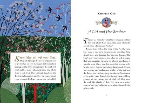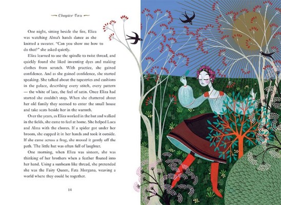 The artwork is stunning. There’s vibrant and angular artwork throughout the book, with gold and black drawings pacing the text between color panels. Eliza is a brave and focused heroine who doesn’t rely on a prince or king to marry her to gain her throne – she and the young king are dear friends, committed to one another as companions. She even declines an offer to serve as his new advisor, because she’s got a kingdom of her own to run. This is a nice addition to fairy tale collections, and great for a nice, empowering read.