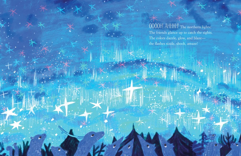 Bright Winter Night is a story in verse, perfect for bedtime reading. A group of woodland creatures come together on a winter evening, using materials around them to create something… wonderful. A quietly joyful celebration of nature, friendship, and creativity, the story builds expectation as this seemingly unlikely group of animals – mice and wolves working together? Rabbits, bears, and birds? Stags and squirrels? – come together with one goal in mind: to enjoy one of nature’s most breathtaking sights. There’s a quiet urgency as the animals work – “They sense there is a task to do / as night descends, replacing blue” – and a spirit of teamwork and conviviality, as everyone contributes to the project and enjoys the moments they spend together. Mixed media artwork in deep blues give a cozy feeling to the chilly winter landscape. Sure to be a readaloud kids will want to hear again and again; keep this one handy for storytimes and winter craft times.
