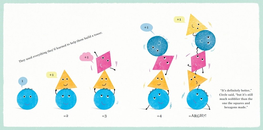 While playing one day, Circle sees the squares and hexagons building a tower and really wants to build one, too. Triangle and Rhombus want to play, too, but the group can’t seem to balance as easily as the other shapes do. They work out, they study, but they keep falling down, until Circle gets some inspiration from above and changes his perspective. Naomi Jones creates a sweet story about teamwork and perspective; James Jones creates colorful shapes with cheerful expressions and spindly black arms and legs. The shapes cheer each other on and support one another, delivering a positive message about playing together and helping one another. A cute addition to concept collections and a fun storytime choice.