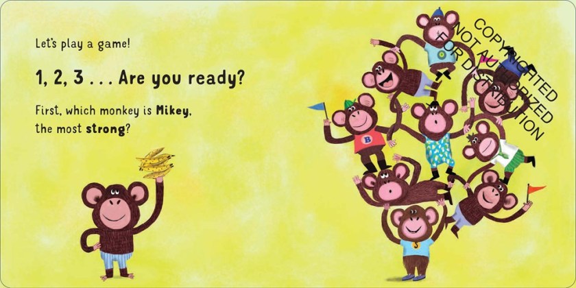 This adorable seek-and-find book challenges readers to pick animals out of a group based on characteristics: who’s the strongest? The cleanest? The most loving? Readers will look for the featured animal based on clues provided in the text: “Which mouse is all ready, with a shirt, pants, and shoes on? It’s Mikey-he’s the most ready!” The guessing game leads up to a delightful reveal, making this a wonderful readaloud for small lapsits and one-on-one reading and cuddle time. Colorful, kid-friendly cartoon animals are attention-grabbers, and naming the animals assures readers will return to this one as they look forwarding to naming their new friends again and again. A good addition to board book collections.