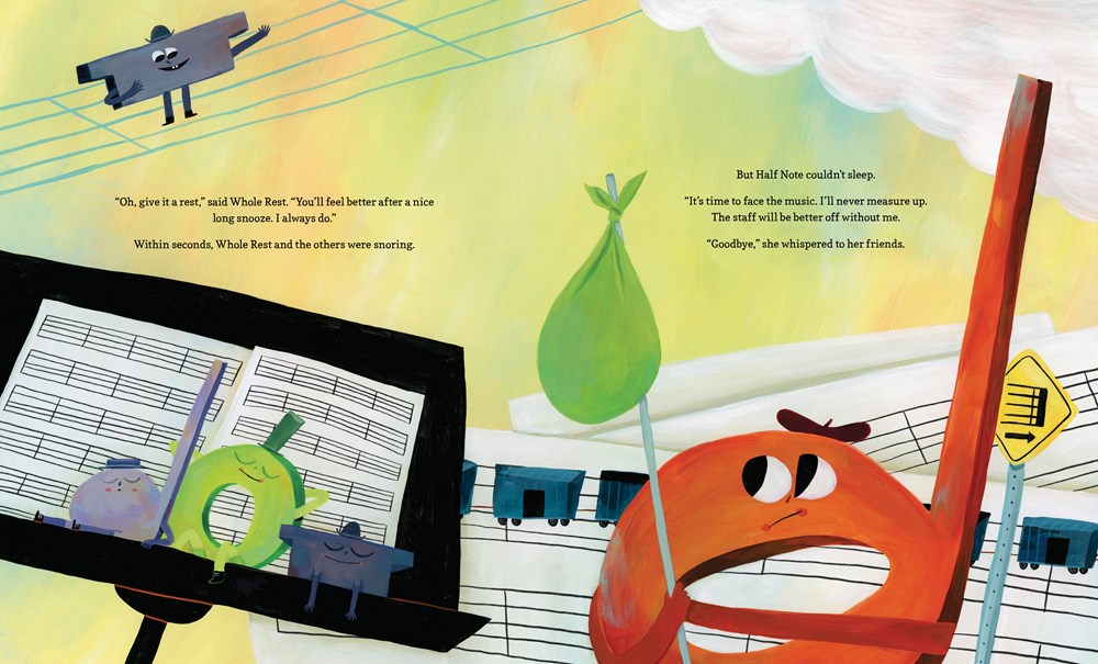 Half Note doesn’t feel like she measures up to the other notes. She can’t fill a whole measure like Whole Note, and she doesn’t have a cute little flag like Eighth Note. Whole Note suggests everyone have a nap, and Half Note decides to run away, deciding that it’s “time to face the music. I’ll never measure up. The staff will be better off without me”. Composer discovers Half Note is missing and panics: she’s integral to the whole piece! Composer comes up with a brilliant idea that will lure Half Note back and assure her that she’s an important part of her musical staff. Filled with musical terminology and puns, anthropomorphic illustrations of friendly-faced musical notes, and colorful artwork, The Note Who Faced the Music is a fun story about teamwork and realizing one’s own worth. A glossary and explanation of musical terms fills the back matter. A good additional purchase where musical books do well.
