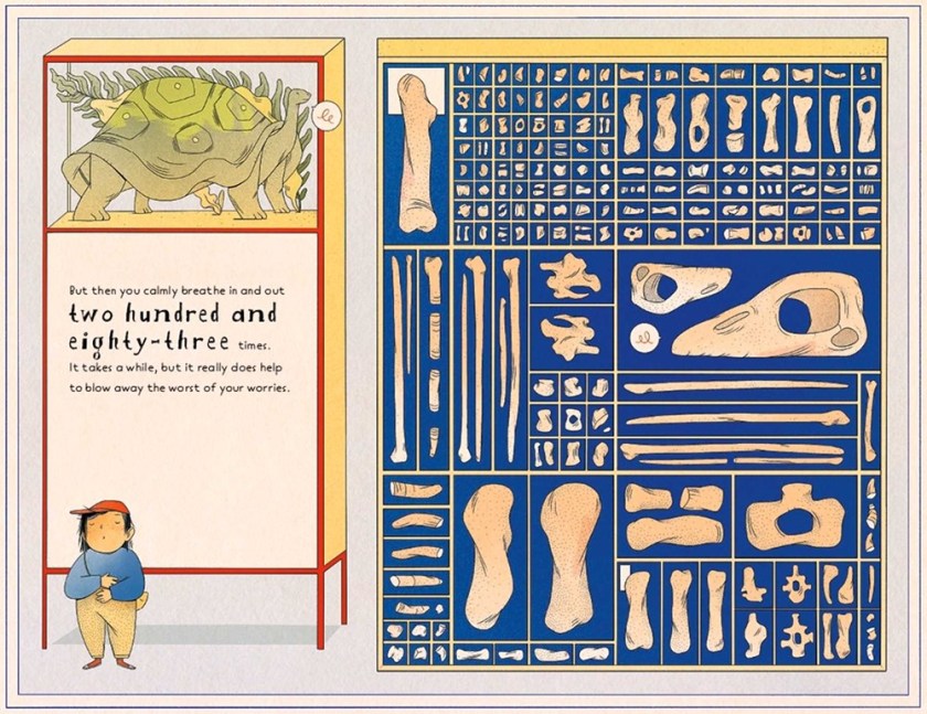Yuri is a kid enjoying a trip to the museum when mayhem strikes in the form of a parakeet that likes to fly around. Yuri is afraid of birds, and proceeds to knock down a giant brachiosaurus skeleton when he tries to get away! This is a definite catastrophe: “the kind of catastrophe that ALWAYS happens when ABSOLUTELY EVERYONE is looking” and sends Yuri into a panic attack. Luckily, he remembers to breathe in and out and that he can always ask for help – and he does! Everyone is happy to pitch in and the end result is nothing short of eye-catching. Brückner’s story about overcoming anxiety and asking for – and accepting – help is spot on and will resonate with readers. Her description of the feelings that hit when experiencing a personal catastrophe are spot on; Yuri’s body language communicates the emotions behind the words. The muted colors provide a calming effect in the middle of the storm of emotions and chaos. With a little imagination and some help, Mayhem shows that you can overcome just about anything. Download a free coloring page at NorthSouth’s website.