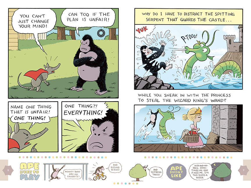 A note from the author/illustrator at the end of the book explains her interest in Antonio. She “illustrates a little “About Me”, showing readers things she likes, like fart jokes, grumpy unidentified things, and strong and funny girl characters, which assures that I should probably become BFFs with her, because I like those things too, and my kids and the kids in my library know it. This will make life so much easier when I booktalk this book (and try to find more of her illustrated books in the US).
