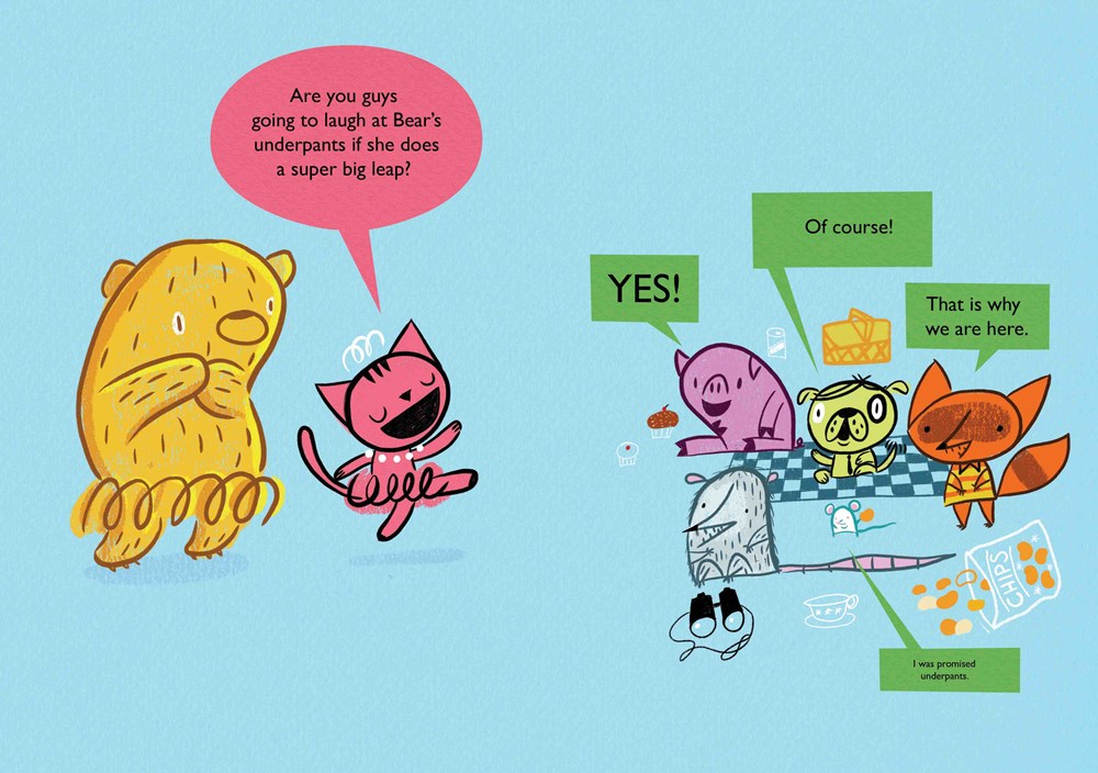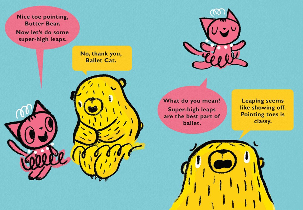 Ballet Cat is back! She and Butter Bear are having a dance playdate, and Ballet Cat wants to do super-high leaps. Butter Bear really doesn’t feel up to it, and keeps trying to put Ballet Cat off in a series of requests that become more outlandish as they go: it’s like showing off; she wants Ballet Cat to make her cereal and ice pops; she has to go to the bathroom; she has to go hibernate… Ballet Cat is getting frazzled! There’s a reason why Butter Bear really doesn’t want to do the super-high leaps… but will she tell Ballet Cat?