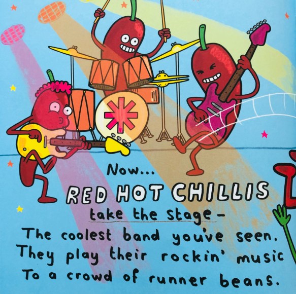 From the team that brought you Kitchen Disco and Bathroom Boogie, we get a Veggie Patch-a-Palooza as the farm beds down for the night and the vegetables take the stage to dance and sing in the mud for a Veg Patch Party! Kids will love seeing cartoon pumpkins put on disco boots, carrots forming a conga line, and red hot chillis rock out on stage. The rhyming story has great repetition with its call to action: “So conga like a carrot, / Party like a pea, / Rock out like a radish, / YEAH! / And boogie like a bean!” Bathroom Boogie went over huge for me at storytime, so I’ll be enjoying Veg Patch Party with my littles next. Perfect for flannel storytimes, and there are lots of cute vegetable coloring pages to have handy. I like doing a “cute vegetable coloring pages” search so you get animated, kid-friendly faces, like this selection. Endpapers have veggie sketches with smiling vegetables to greet readers. Pair with one of my oldies but goodies, Food Fight, for a storytime about feisty food.