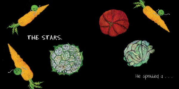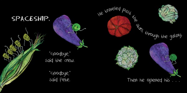 From the team that brought you Kitchen Disco and Bathroom Boogie, we get a Veggie Patch-a-Palooza as the farm beds down for the night and the vegetables take the stage to dance and sing in the mud for a Veg Patch Party! Kids will love seeing cartoon pumpkins put on disco boots, carrots forming a conga line, and red hot chillis rock out on stage. The rhyming story has great repetition with its call to action: “So conga like a carrot, / Party like a pea, / Rock out like a radish, / YEAH! / And boogie like a bean!” Bathroom Boogie went over huge for me at storytime, so I’ll be enjoying Veg Patch Party with my littles next. Perfect for flannel storytimes, and there are lots of cute vegetable coloring pages to have handy. I like doing a “cute vegetable coloring pages” search so you get animated, kid-friendly faces, like this selection. Endpapers have veggie sketches with smiling vegetables to greet readers. Pair with one of my oldies but goodies, Food Fight, for a storytime about feisty food.