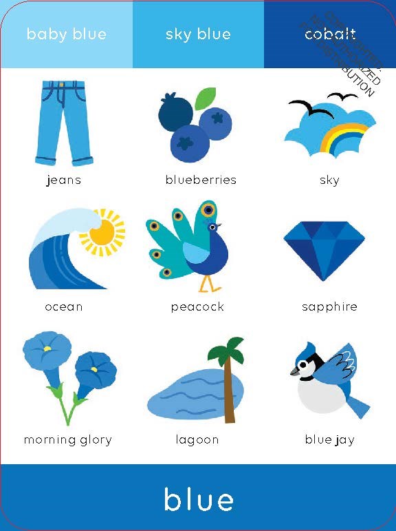 This oversized deck of ten cards is perfect for learning color. The die-cut cards let little hands feel and trace color names and a primary image on each card. Card backs show different shades of the featured color and other items of the same color. Purple is the color of a violet, with accompanying vocabulary words to help kids visualize and identify the world around them: flower / blossom / petals / leaf / stem / wild / delicate. On the back, shades of lilac, violet, and indigo give children additional shades of color, with examples including an iris, an eggplant, and grape jelly. The cards are study and will hold up to exploration; you may lose some in circulation, but keep a set or two handy for your storytime/playgroup collection.