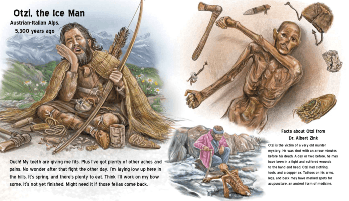 Meet some mummies and hear their stories: this volume contains stories about 12 different mummies: elephants, bison, dogs, cats, and humans, including the world’s most famous mummy, King Tut. Each spread focuses on one mummy, providing its date and location, and “before” and “after” illustrations that show readers what the animal or person most likely looked life while alive, and what its mummy looks like today. Facts gleaned from research and scientific observation bring each mummy’s story to life for readers, and provide clues to each demise. Discussions about different types of mummification, a mummy map of the world, and features on scientists’ tools and technology make up the back matter For Creative Minds section.
